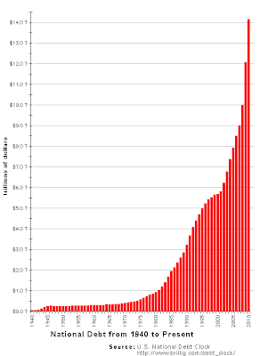 I want to show the following chart, a recent, but not up to the minute version of the data, which shows the growth of the debt in the last century. I like this format because the linear vertical scale clearly shows - with a minor hitch - exponential growth, and that's the fundamental problem (source is from January):