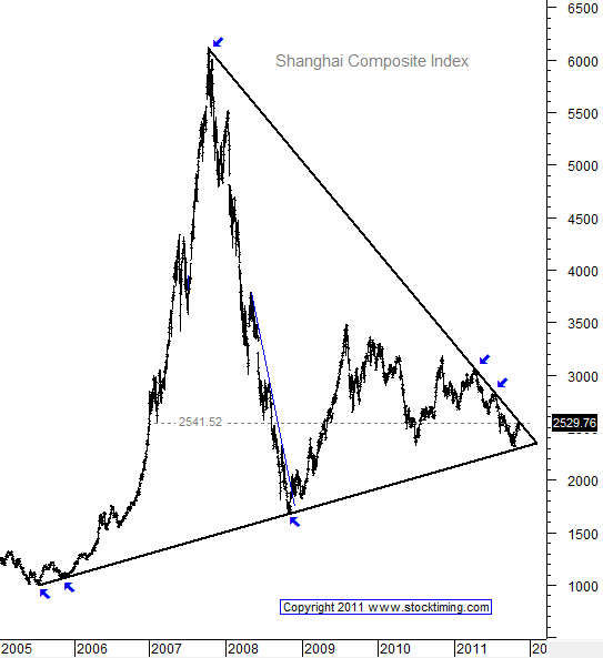 When these triangle (also called flag or pennant) patterns appear, the tracked data has to break out of it; there is simply no way it can't. Which way is it going to break? That's the bazillion dollar question. No one can answer that based on this chart. In the larger sense of what drives investment in the Shanghai market, capital from US and EU sources certainly flows into that picture. As EU wealth gets sucked up into the ponzi scheme to keep the EU alive, will there be any to look for opportunity in China? Same question about dollars?
