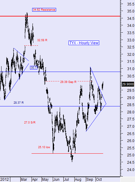 All that background out of the way, it looks like there has been an issue this week. This is a plot of the yield on the 30 year bond, courtesy of http://www.stocktiming.com (they change the graphic at this URL every day, but it will probably be there until Monday, 10/22/12)