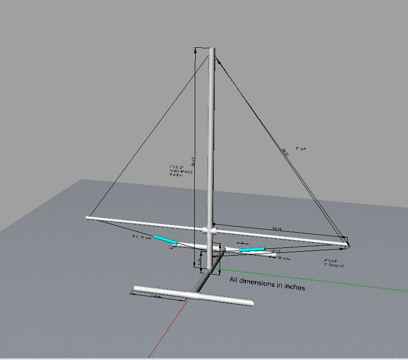 The dimensions aren't readable when scaled out this far, but the center is an 8' tall piece of 2" schedule 40 PVC pipe. The cross members are 1" PVC, which may sag given that they're 4'4" long. Since the loop is going to be #22 wire, it's not like there's much weight out there, but they may sag under their own weight. The base it stands on is all 2' sections of PVC with some Tees joining them.