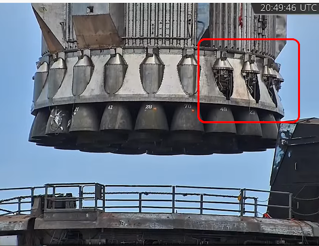 Yesterday morning, he added that to get the room and visibility they need they'll go back to high bay. This is a job for the chopsticks on the Orbital Launch Integration Tower, and it lifted B7 onto one of the self-propelled transporters - multi-axled, high weight capacity vehicles - around 4:30 PM. I grabbed a screen capture of the booster as it got high enough to be visible. In the Lab Padre chat area this morning, someone said that one Raptor had been replaced out at the pad either earlier in the morning or last night.
