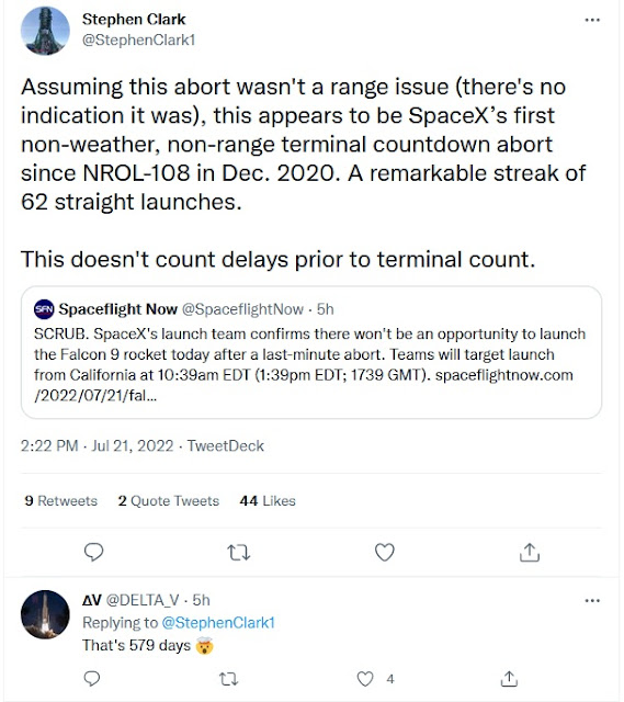 That's 19 months practically to the day; the NROL-108 launch that Clark mentions was on December 19th. Considering that they've been launching at an average of once every 6.4 days so far this year, that's a remarkable record.